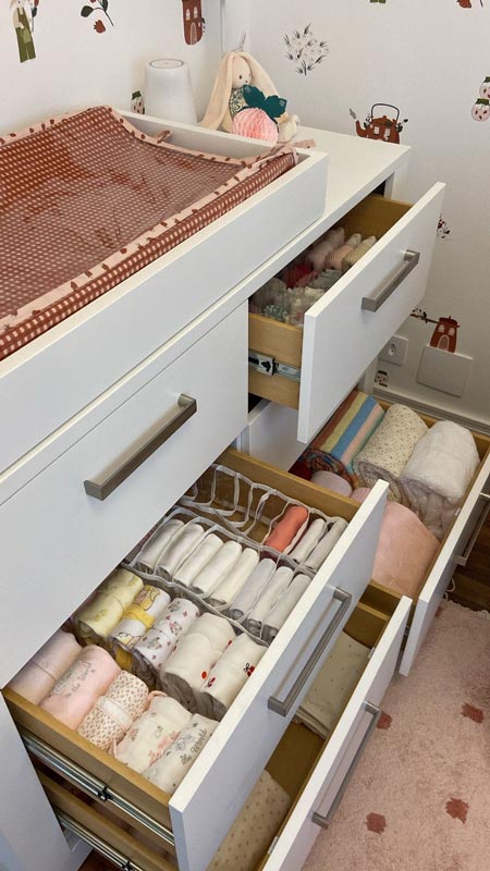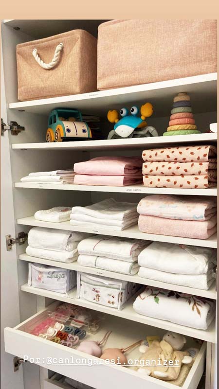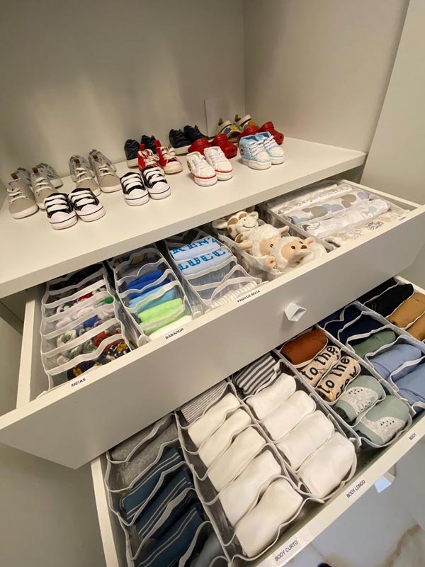 ▪︎ Organização do enxoval do bebê – todos os itens categorizados e separados por tamanho, com soluções práticas para facilitar o dia a dia.